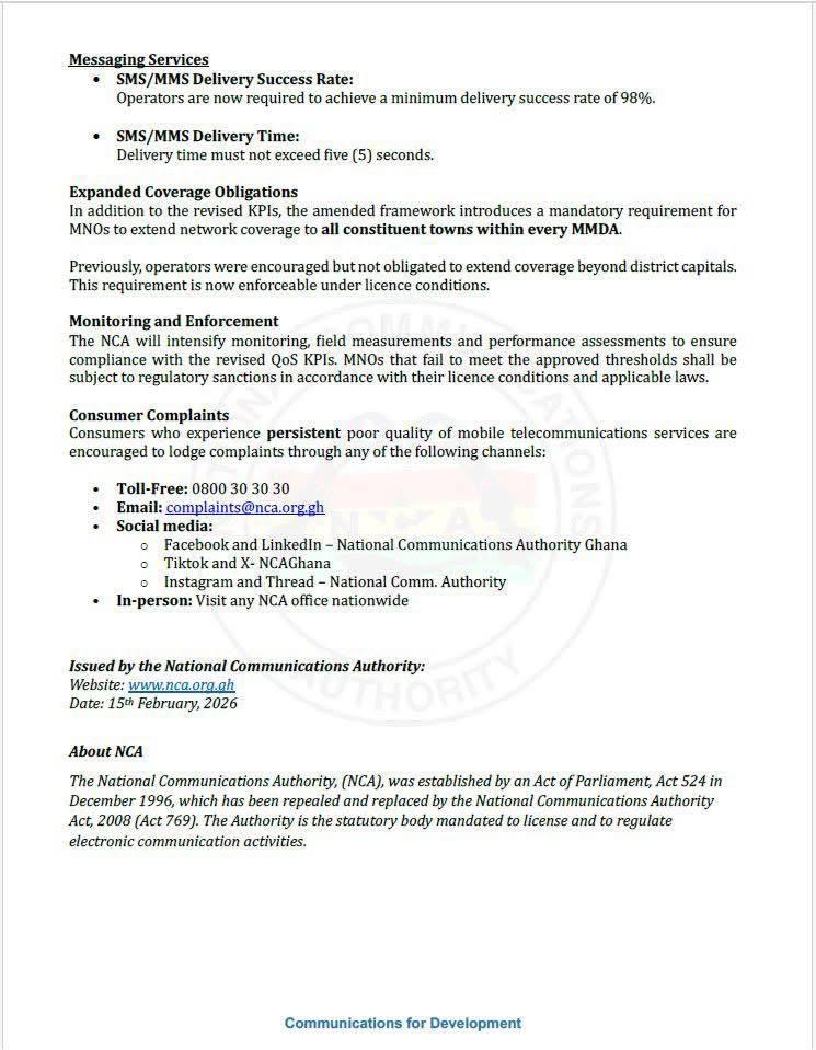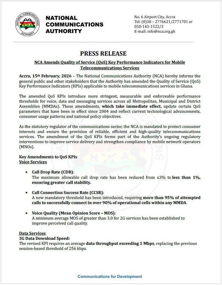 The NCA in a statement released on Sunday, February 15, 2026, said it has amended the Quality of Service (QoS) Key Performance Indicators (KPIs) applicable to mobile services in Ghana, describing the new thresholds as “more stringent, measurable and enforceable.”